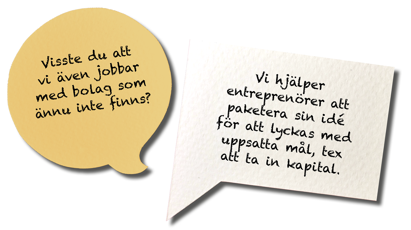 Oavsett om du är entreprenör med en ny idé eller företagsledare som vill expandera till nya marknader, lansera en ny produkt eller slå samman varumärken, vi hjälper dig hela vägen. Vi bygger även investeringscase för affärsidéer som behöver kapital.